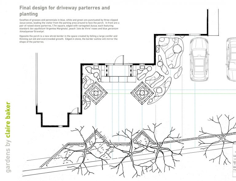 Blending formal with informal elements, the design defines the route to the new porch so one arrives facing the front door and not from the side. In addition to the supply headaches for plants and materials created by the Covid pandemic, there were various issues to overcome including the lack of distance to the boundary wall opposite the house, a network of services criss-crossing underground and the area faces north!