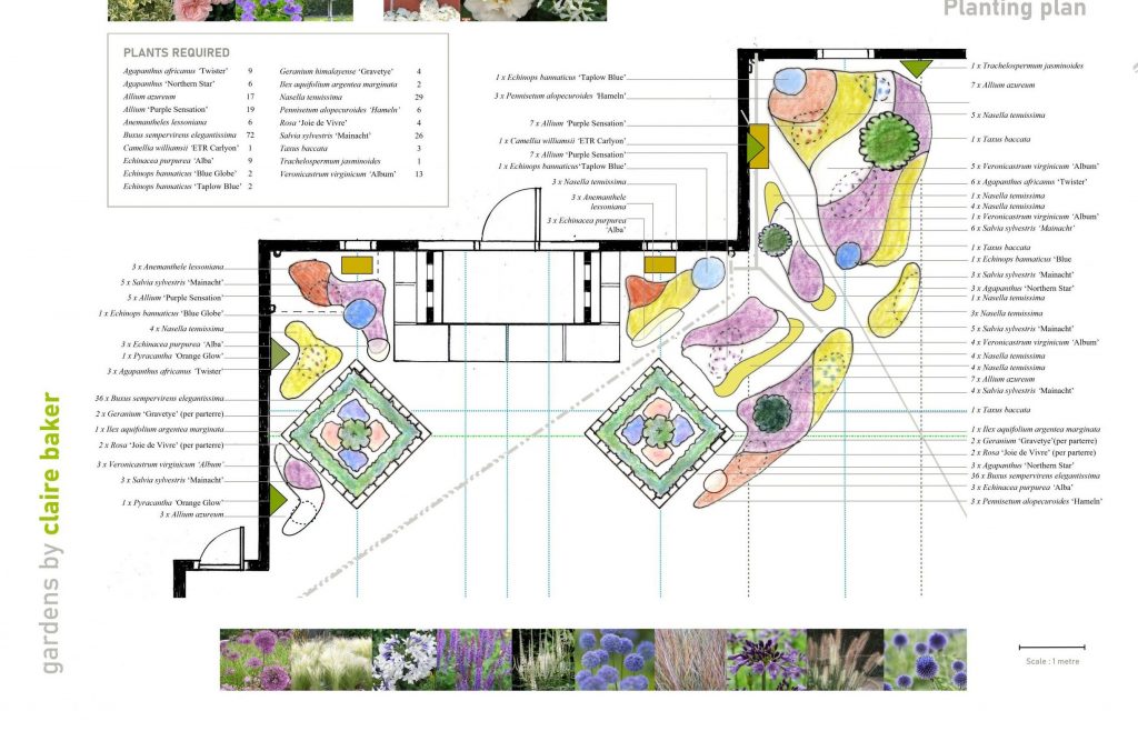 Two large raised stone parterres now stand either side of the front porch, planted with ‘Joie de Vivre’ roses, geranium himalayense ‘Gravetye’, standard ilex aquifolium argentea marginata and variegated buxus sempervirens elegantissima. Sweeping around towards the parterres are swathes of grasses such as nassella tenuissima and pennisetum alopecuroides and ribbons of perennials including salvia sylvestris ‘Mainacht’, veronicastrum virginicum alba, echinops bannaticus and agapanthus. This less formal planting is punctuated by three clipped cones of yew (taxus) for height and interest.
